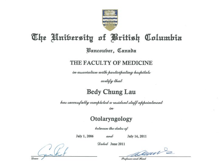 From there, he received rigorous medical residency training at the University of British Columbia, and has since become certified as a fellow of the Royal College of Physicians and Surgeons in Otolaryngology - Head and Neck Surgery. Dr. Lau is affiliated with Fraser Health.